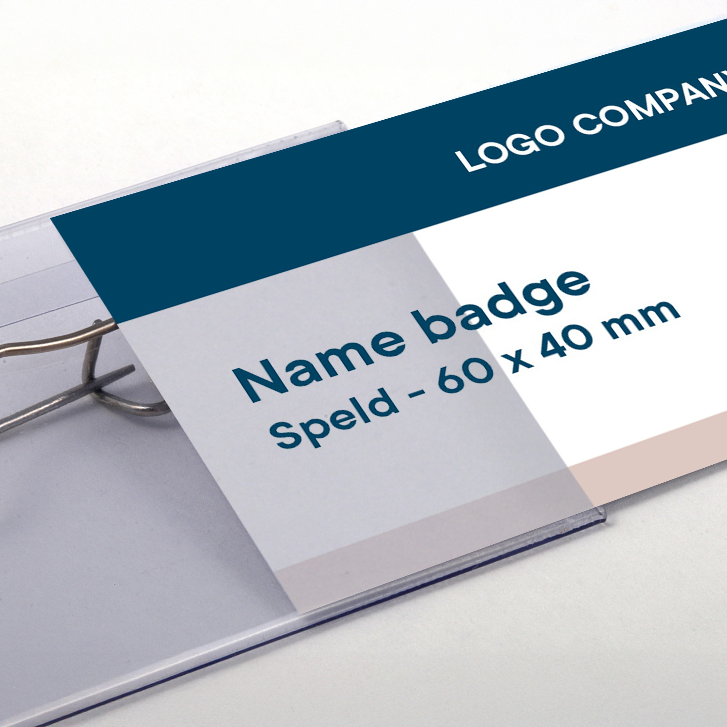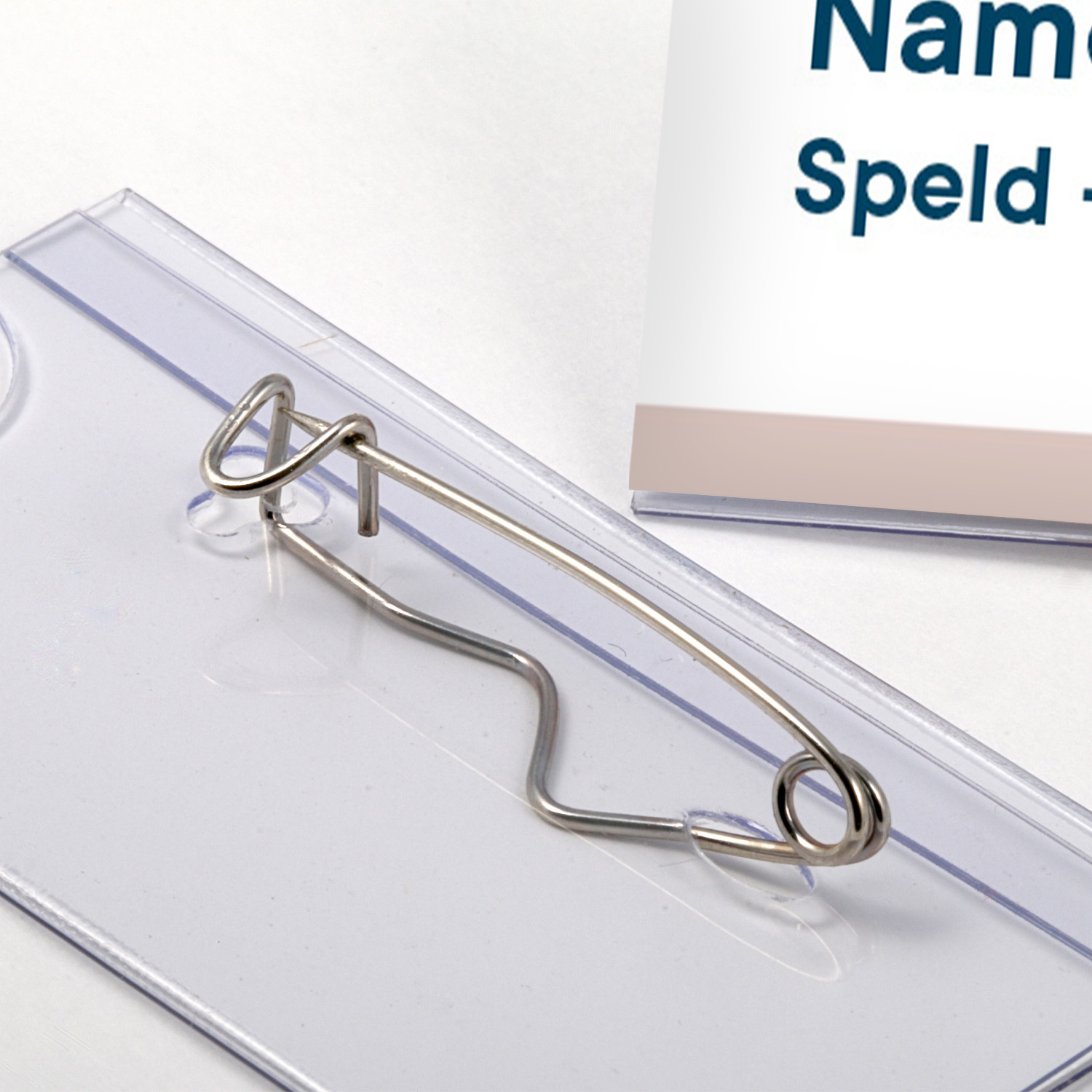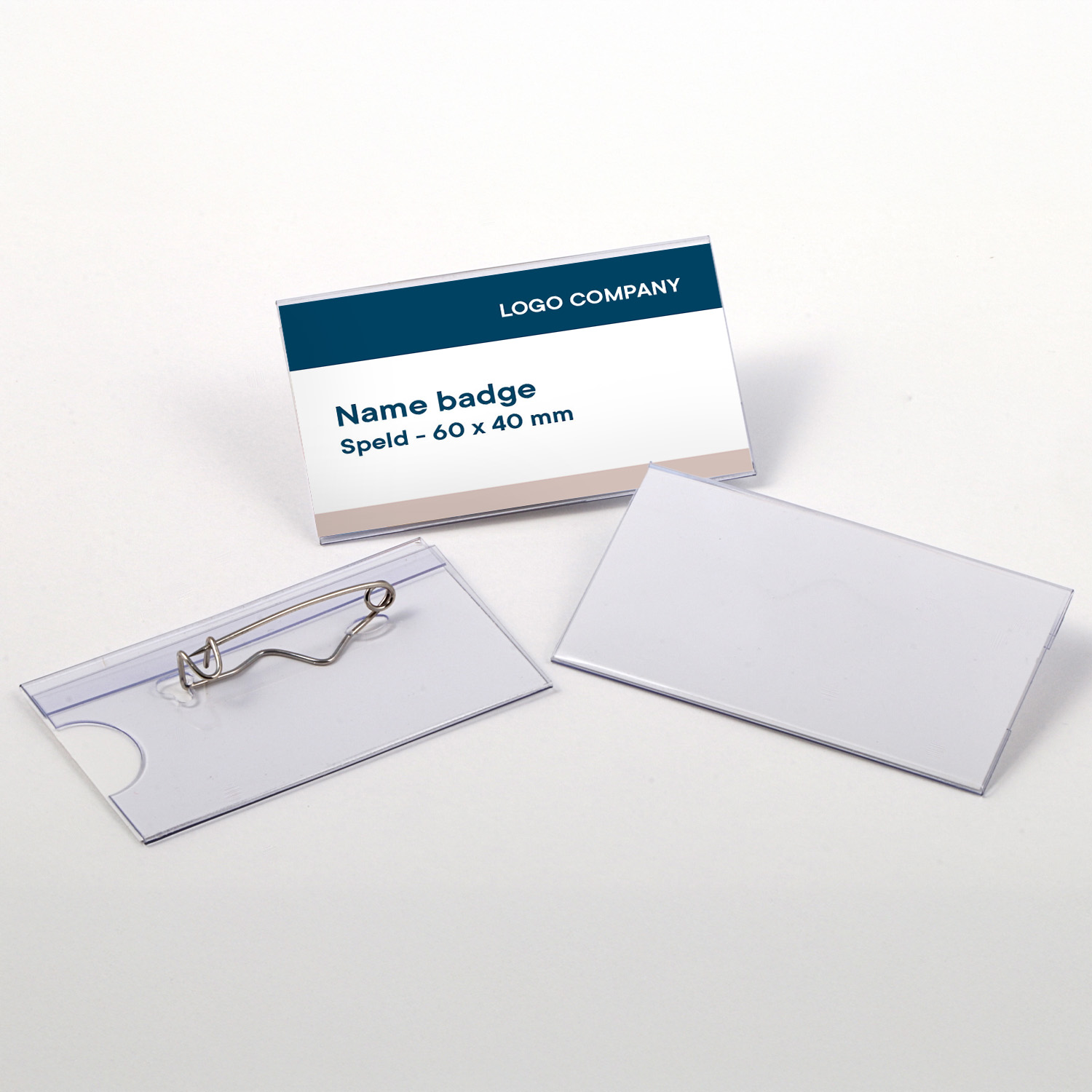 Badge gemaakt van helder transparant PVC van 0,3 mm dik. Met duimgreep voor het gemakkelijk insteken van het naamkaartje. Voorzien van een speld waarvan de punt is beschermd. Afmeting insteekkaartje Breedte x Hoogte 60x40mm. Doosje met 24 badges en losse insteekkaartjes.