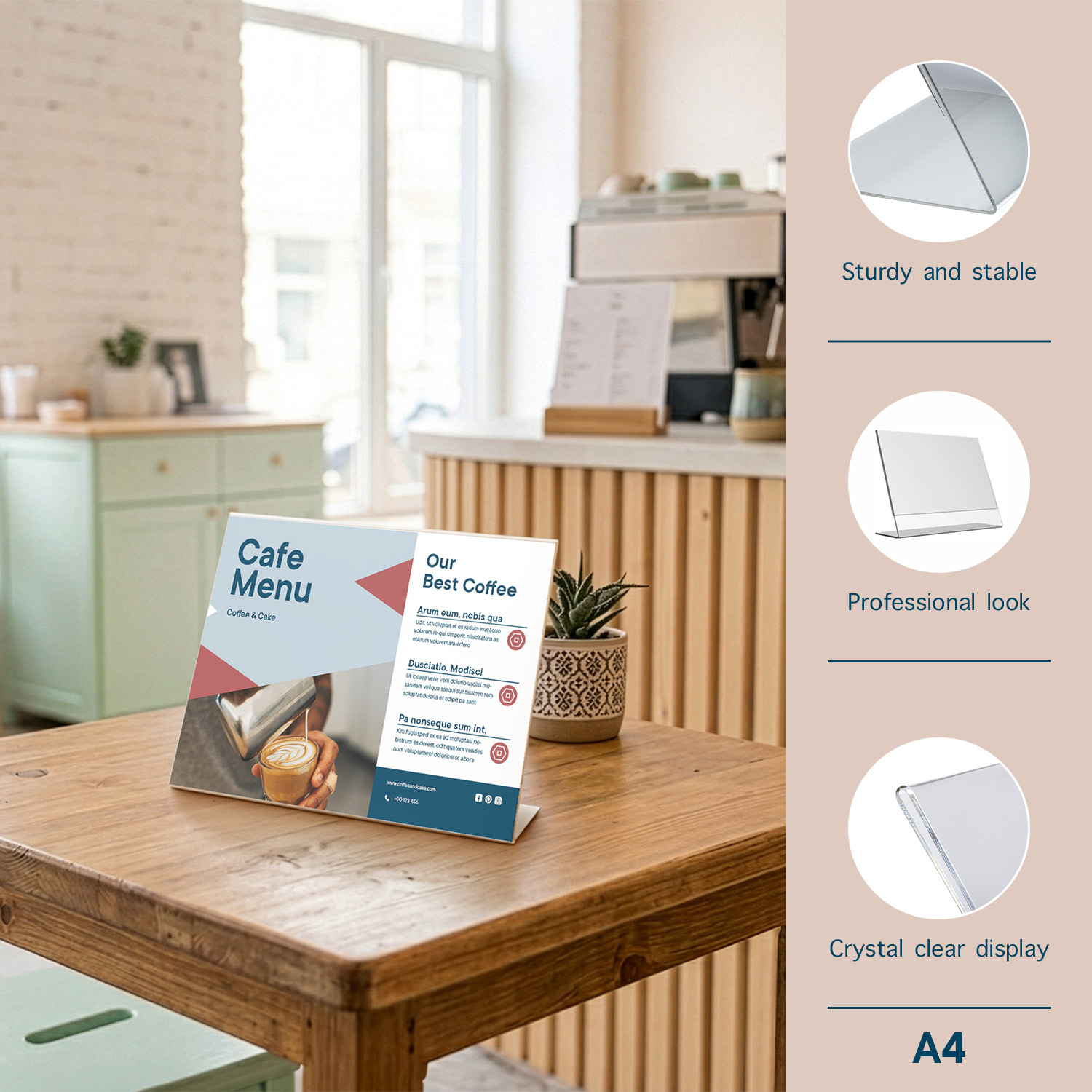 *Kaarthouder voor een representatieve presentatie van folders en prijskaarten.*L-standaard. *Hoogwaardig glashelder acrylaat. *Geschikt voor papierformaat A4 liggend.