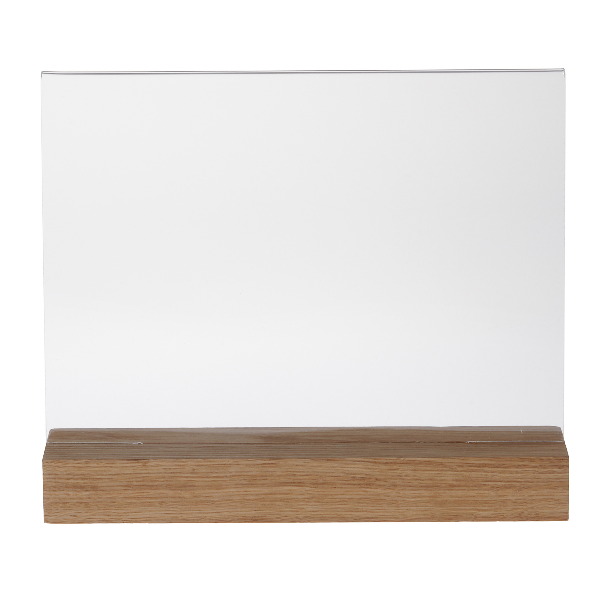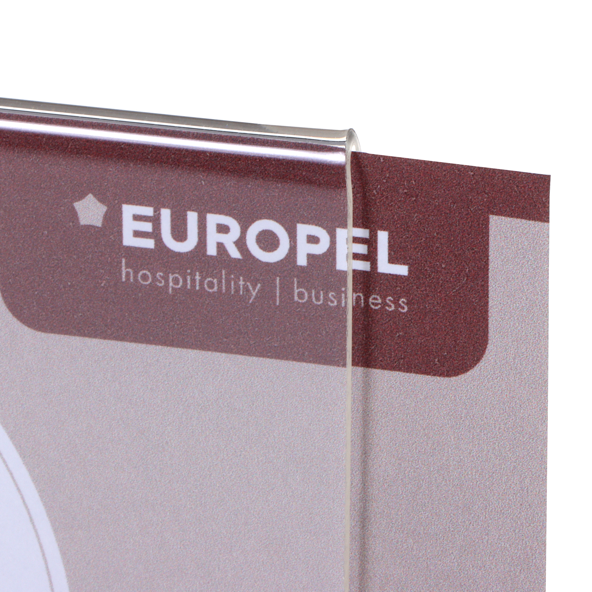 Deze Europel kaarthouder biedt een stijlvolle en praktische manier om menukaarten, informatiekaarten, prijsaanduidingen of promotieberichten te presenteren. De massieve houten voet met S-groef zorgt voor een stabiele plaatsing, terwijl het glasheldere acryl uw A5-inhoud in horizontale weergave uitstekend zichtbaar maakt.