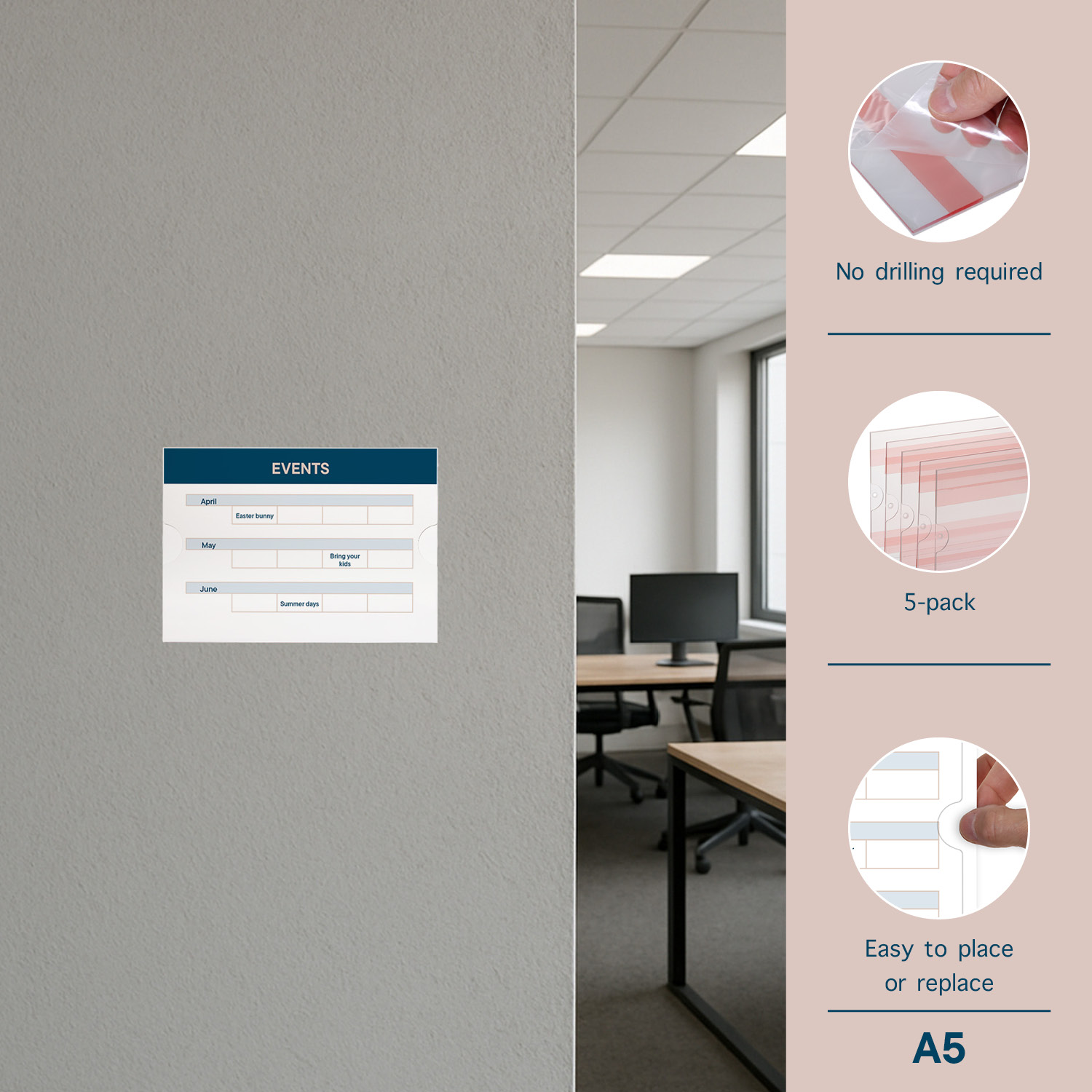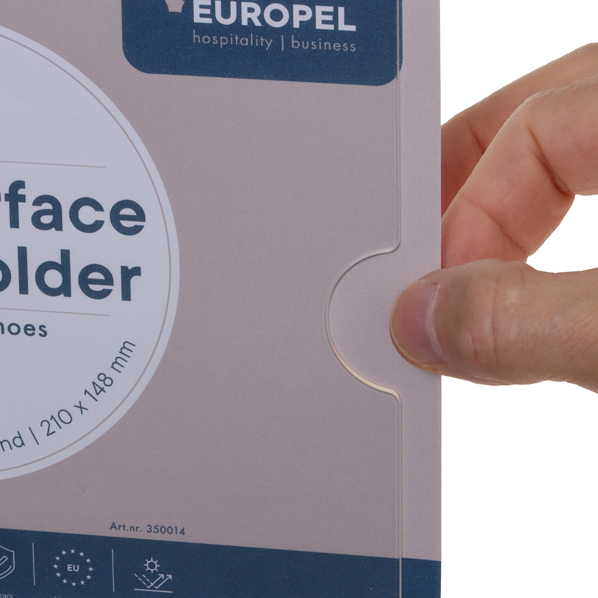 De Europel Multi-Surface Posterhouder in A5 horizontale uitvoering is ideaal voor compacte informatiepresentatie zoals prijskaarten, kleine posters, openingstijden, instructies en aankondigingen. Dankzij de zelfklevende strips kan de hoes zonder boren worden bevestigd op vrijwel elke gladde ondergrond, zoals muren, ramen, deuren, kasten, lockers of panelen.