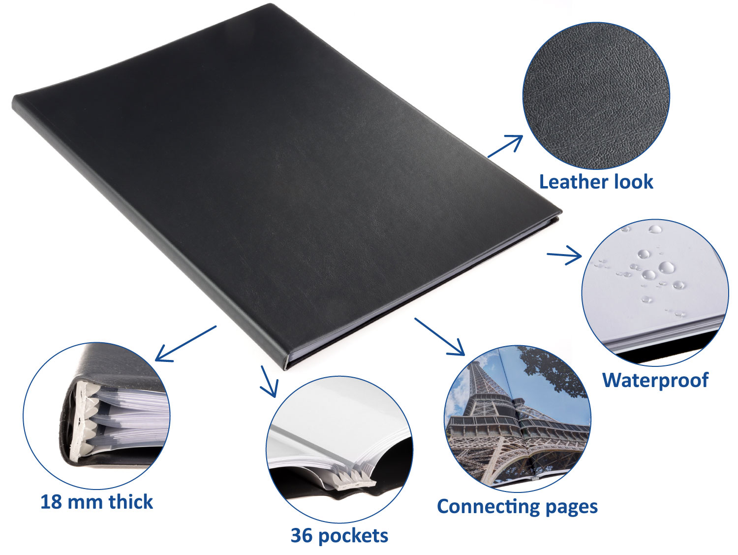 Rillstab showalbum A3 original vervaardigd uit generfd kunststof materiaal. In het midden het unieke Rillstab mechaniek voorzien van 36 binnentassen = 72 zichtzijdes A3 formaat uit zuurvrij polypropyleen. De binnentassen vervaardigd uit polypropyleen materiaal, glashelder, niet reflecterend, dikte 50 mu. Aan de rechter binnenzijde een verticaal insteekvak over de volledige hoogte. Kleur zwart. Ruimte- en gewichtbesparend ten opzichte van andere presentatiemappen en ringbanden. Bladeren als in een boek.